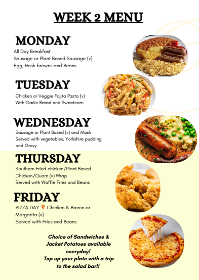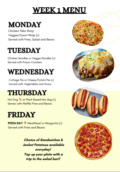 Our school menu offers a wide variety of nutritious meals to suit all tastes and dietary needs. Each day, students can choose from a selection of hot and cold options, including freshly prepared dishes, healthy snacks, and vegetarian choices. We are committed to providing balanced meals that support student wellbeing and promote healthy eating habits.
